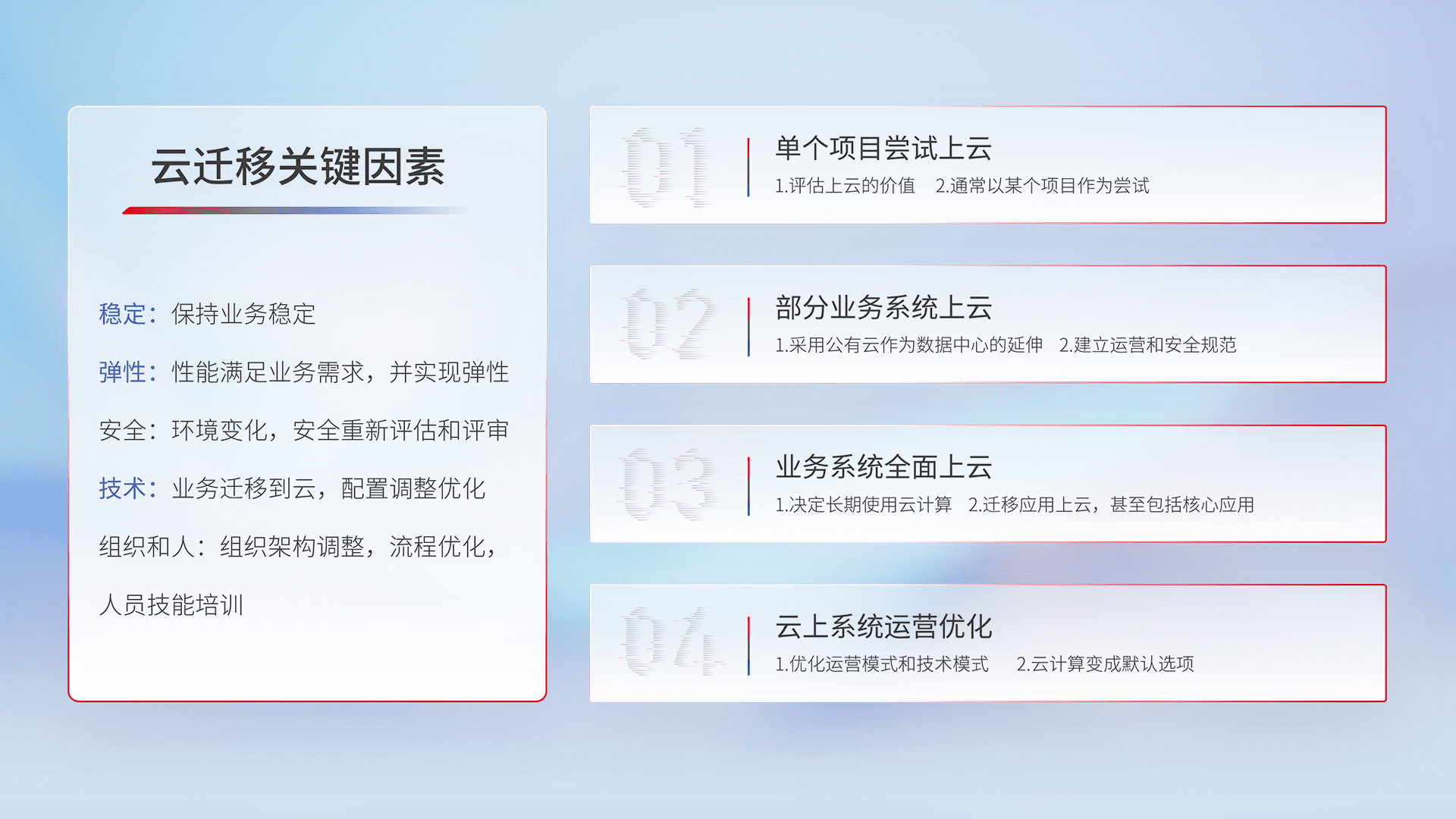 结合实际业务,,,从规划设计、、、、云平台选型、、云原生改造、、、、数据迁移、、、、集成交付,,迁移全过程为客户识别最佳上云路径,,,,做好风险识别管理,,设计网络架构、、、、身份权限、、安全审计合规、、操作审计、、日志审计、、、、监控告警策略、、多站点容灾设计等,,,,对云上基础设施进行整体规划,,,提升IT治理水平,,以满足弹性、、、高可用、、高性能的需求。。。。