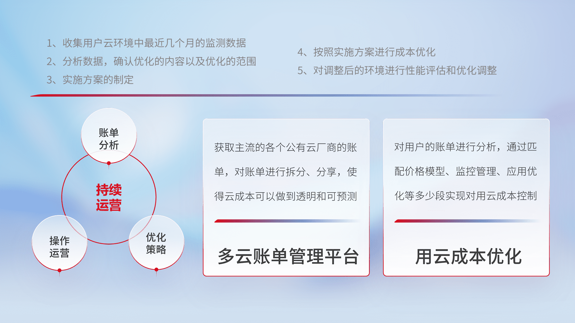 通过多云纳管,,,以统一的资源数据模型把客户的云资源进行抽象和封装,,,,进而实现对多云资源的统一操作,,,,保障云资源管理的可靠性、、、稳定性与可用性。。。。量身定制化运维内容,,,,配置、、开发运维、、、补丁管理、、、、备份、、、监控、、、认证和访问管理、、、、审计和日常巡检等,,,保障在用云过程中的可靠度,,,,稳定度以及高可用率。。。