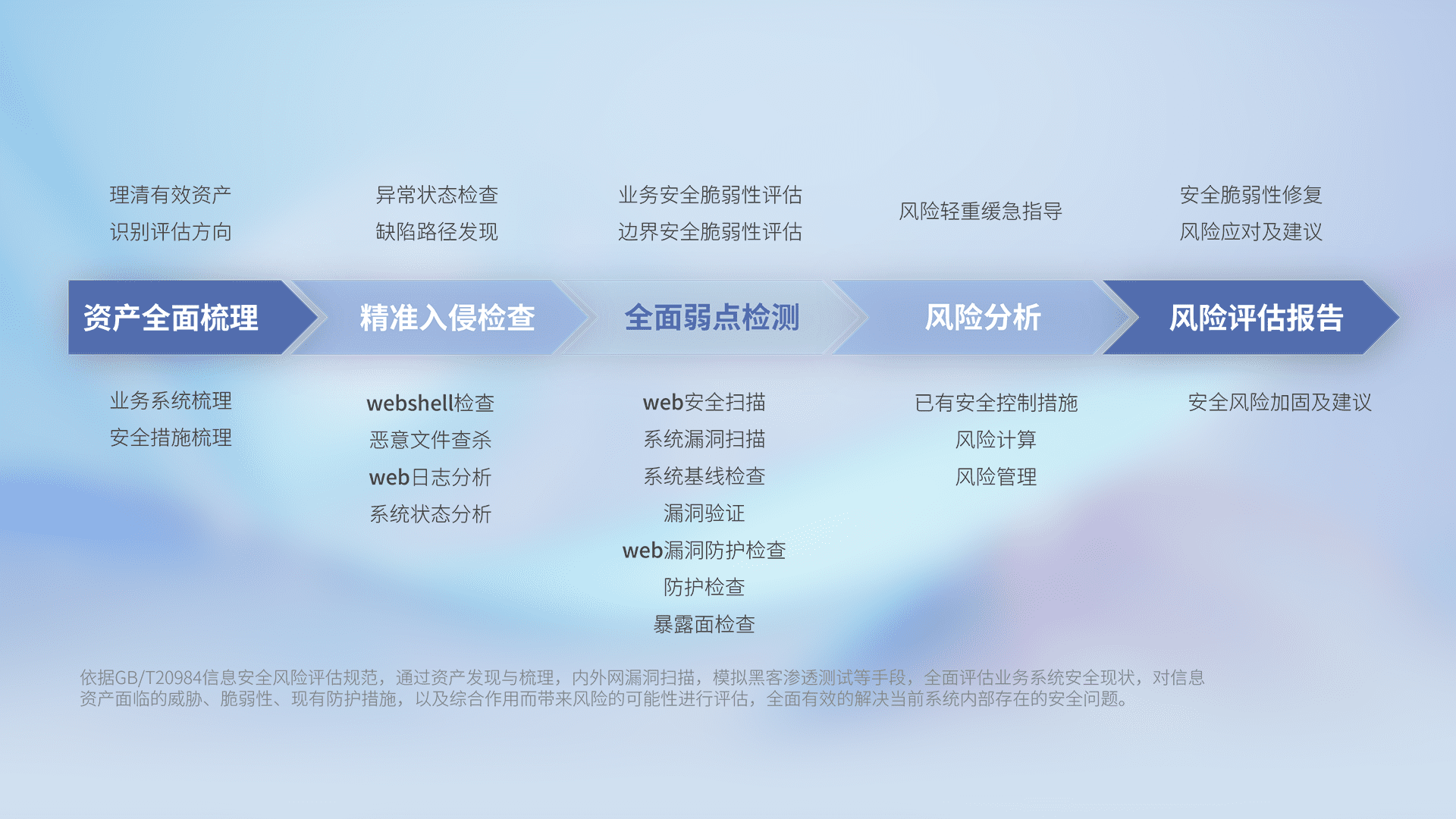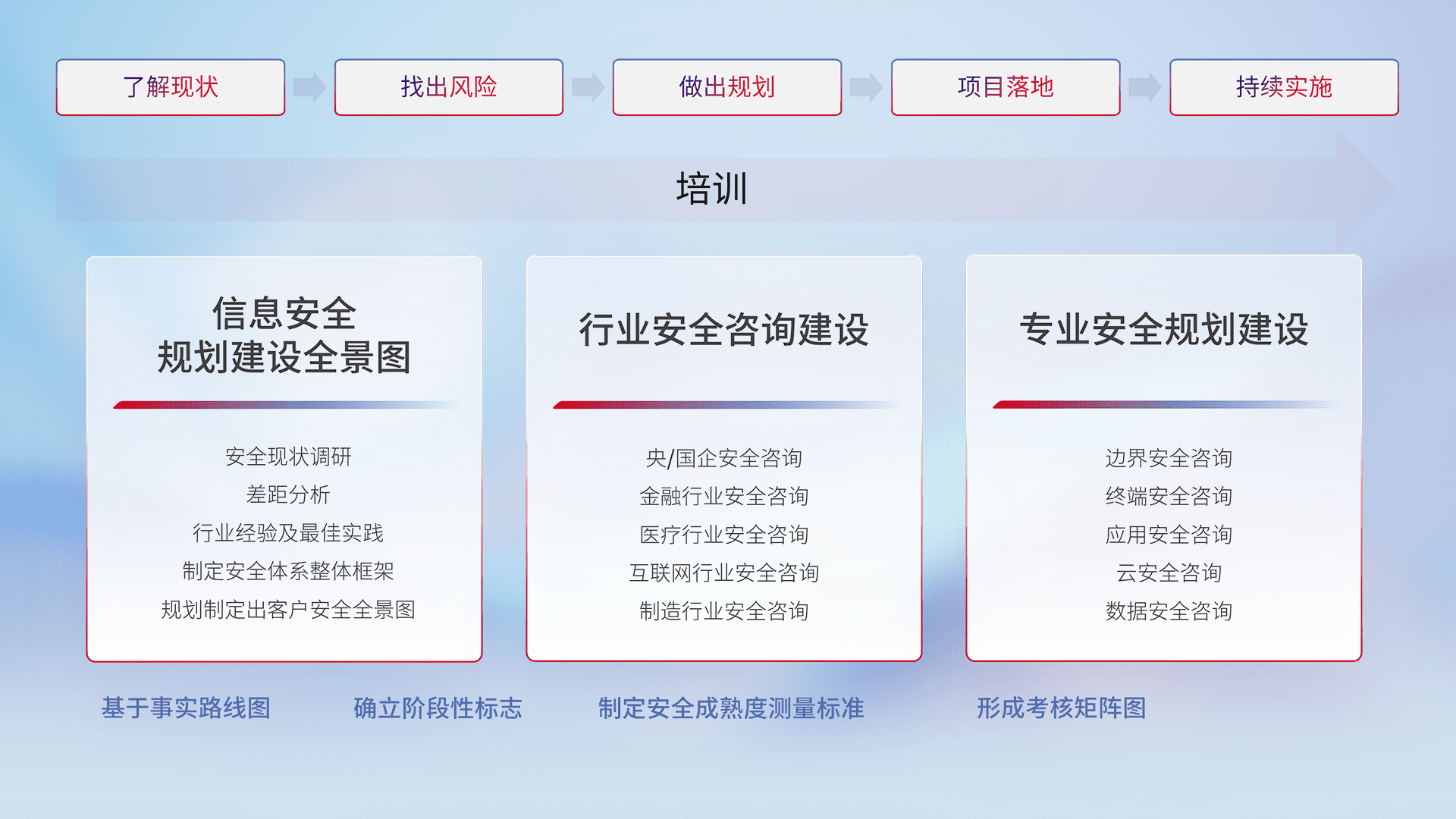 针对客户行业特性,,,,以专业的安全服务+多厂商联合解决方案提供专属的一站式安全管理服务,,,,帮助客户全面感知网络空间威胁,,,,基于识别、、、检测、、、分析、、、、防护、、监测、、响应的服务理论模型,,,,从方案咨询、、、、集成交付、、、评估验证、、、、优化加固、、、运维运营,,,致力于为客户提供完整的闭环管理式安全服务。。。。以实战经验为客户打造高抵御风险的安全体系,,帮助客户发现威胁、、、对抗威胁、、、、处置威胁,,,不断积累安全对抗能力,,,,持续保障数字化安全。。